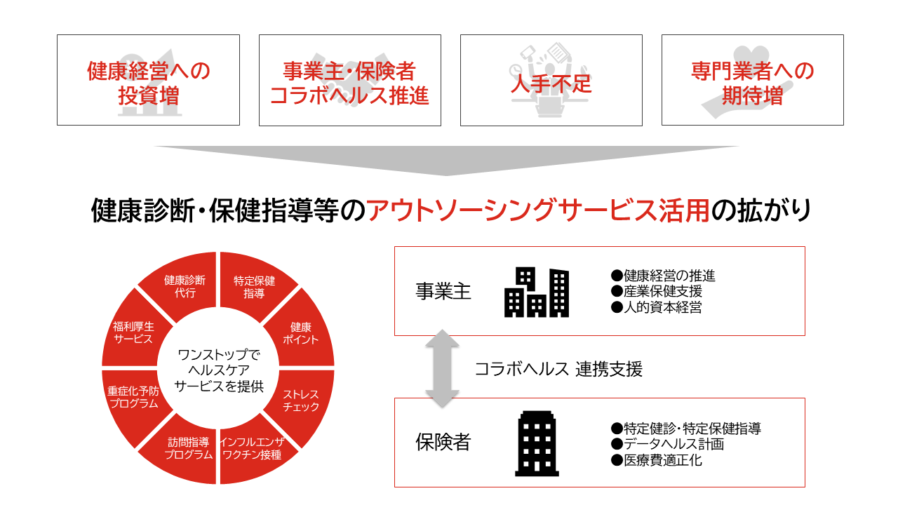 健康経営や人的資本経営など、企業の人事部門では、従業員の心身健康管理への関心が高まっております。一方で、企業内においては人手不足の事情があることから、今後は、健診・保健指導等のアウトソーシングサービス活用が一層進むと見込んでおります。