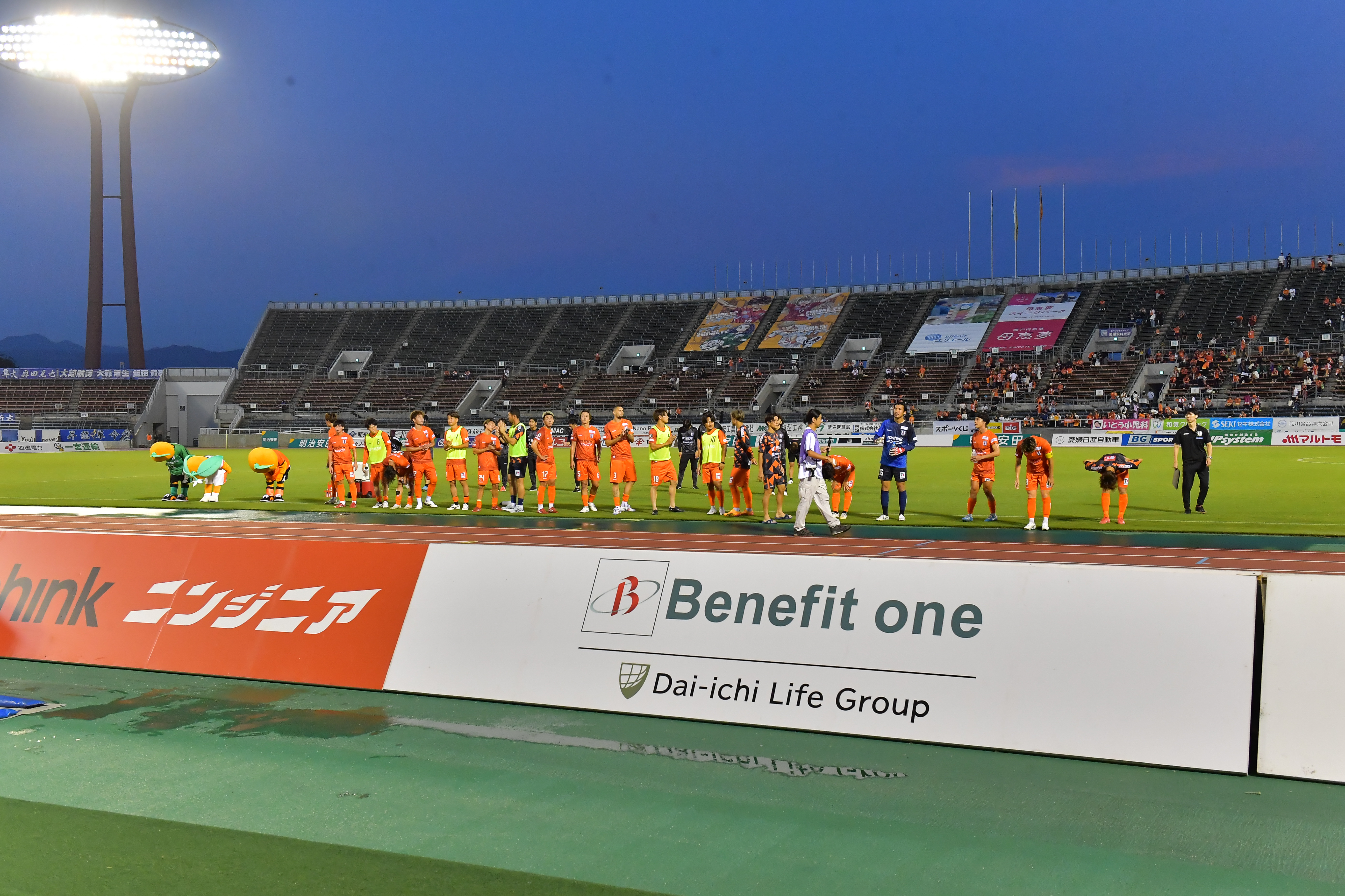前半を1-0で終えたものの、後半に入って反撃を受け立て続けに失点。サポーターからは「まだまだやれるぞ!」という声援が送られ、選手もそれに応えるように最後まで走り抜けました。しかしながら、後半40分に3点目を決められ1-3で試合終了。